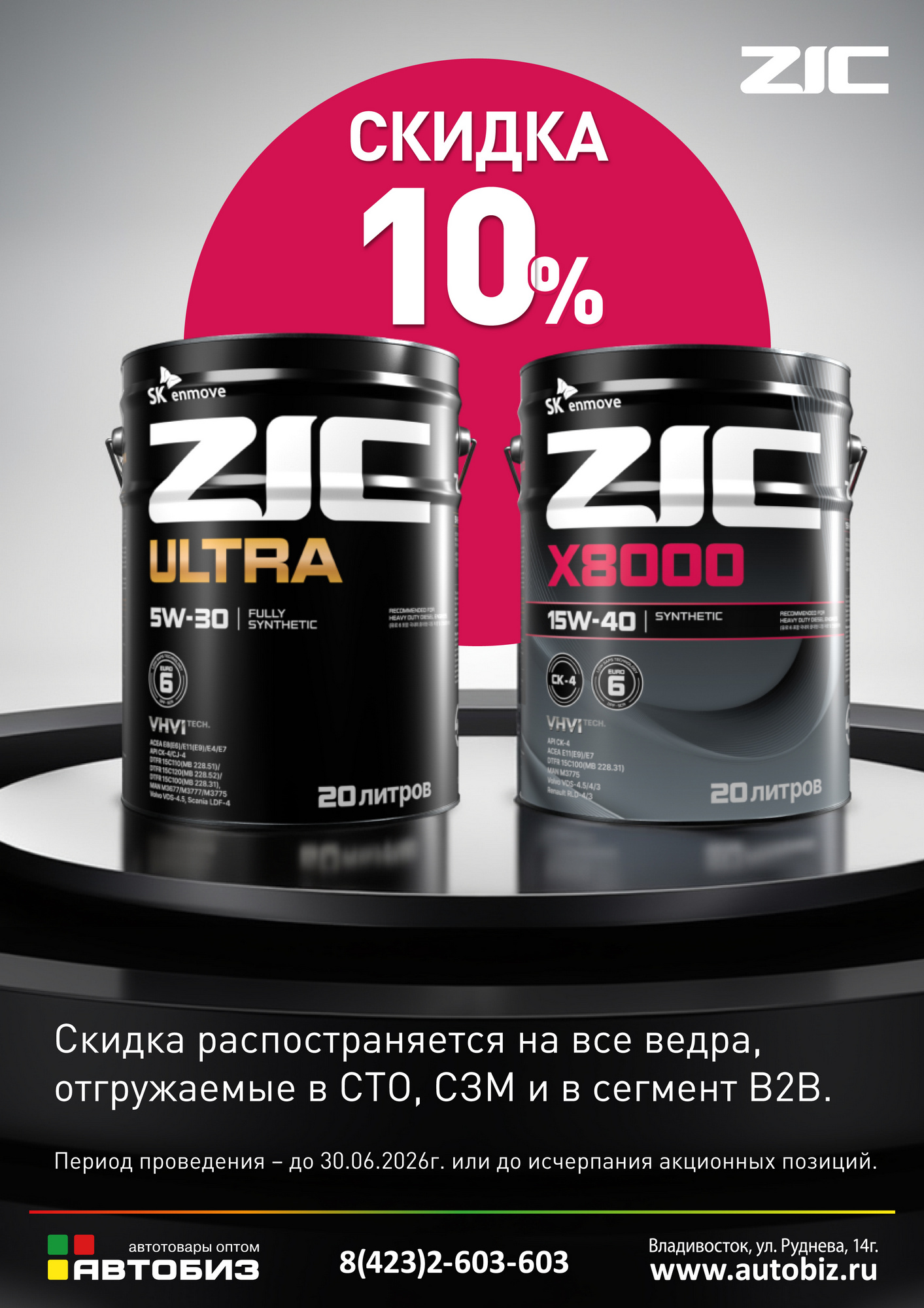 Скидка предоставляется при покупке масла ZIC в фасовке 20 л — от одного ведра. Предложение действует для отгрузок в СТО, СЗМ и сегмент B2B.