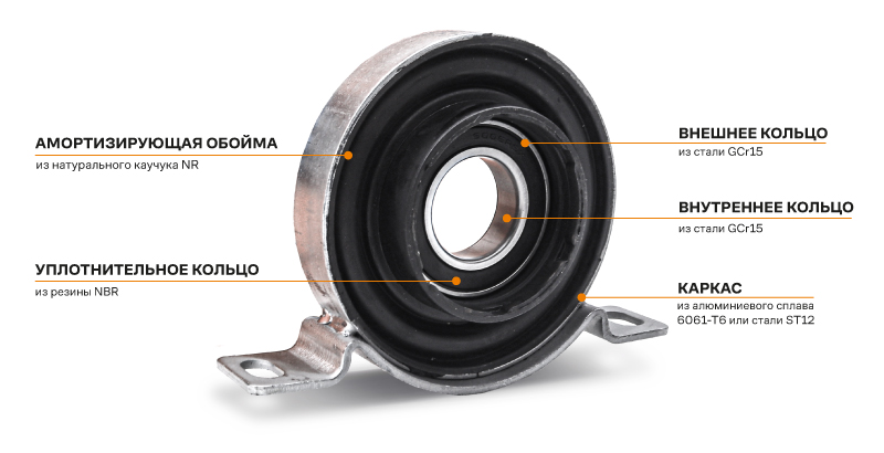 Подвесной подшипник обеспечивает поддержку и стабильное вращение карданного вала задне- и полноприводных автомобилей. Его основные задачи: надёжная фиксация промежуточной части кардана, компенсация вибраций и осевых смещений при передаче крутящего момента от коробки передач к ведущей оси.
