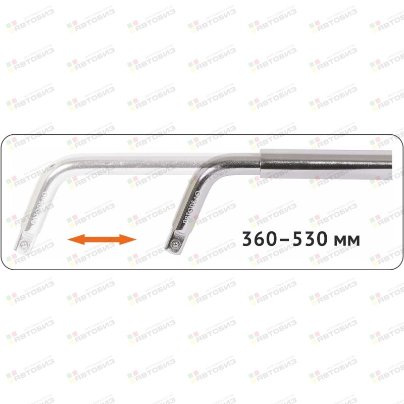 Ключи баллонные торцевые L-образные телескопические Изготовлены из хром-ванадиевой стали методом горячей штамповки (ковки на молотах). Имеют стандартный присоединительный квадрат 1/2 (12.5 мм). Укомплектованы двусторонней торцевой головкой со стандартным присоединительным квадратом 1/2 (12.5 мм). Торцевые головки со стандартным шестигранным рабочим профилем. Изменяемая длина плеча ключа от 360 мм до 530 мм. Снабжены резиновой рукояткой с рифлением для снижения давления на ладонь и предотвращения проскальзывания. Защищены от коррозии хромоникелевым покрытием.