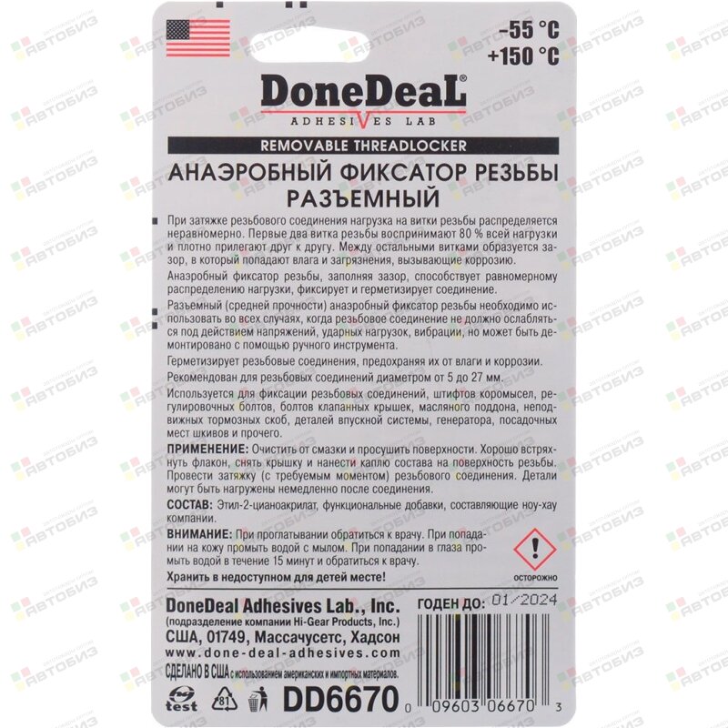 Купить Фиксатор резьбы DoneDeal Разъемный, Анаэробный, 3мл (1/12), DD6670 и другие автотовары в оптовом интернет-магазине Автобиз с доставкой. Мы работаем по всему Дальнему востоку и Сибири. На нашем сайте вы можете подобрать запчасти под нужный автомобиль и сразу заказать их. Всегда в наличии большой ассортимент автозапчастей, автоаксессуаров, автохимии и масел.