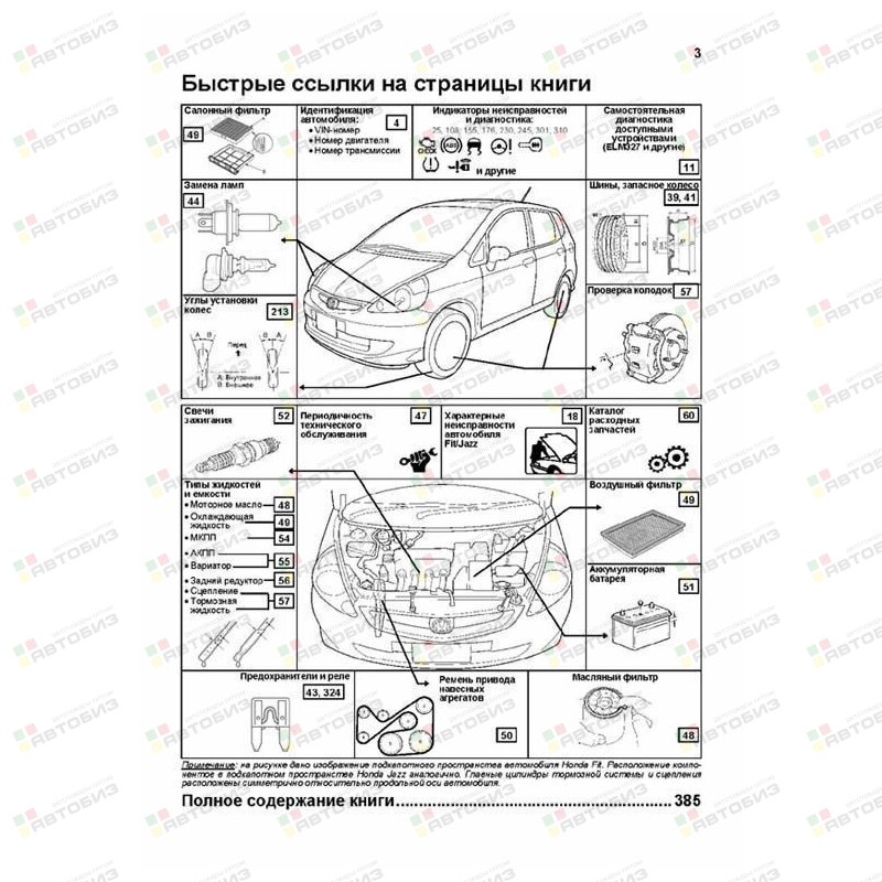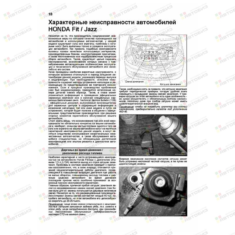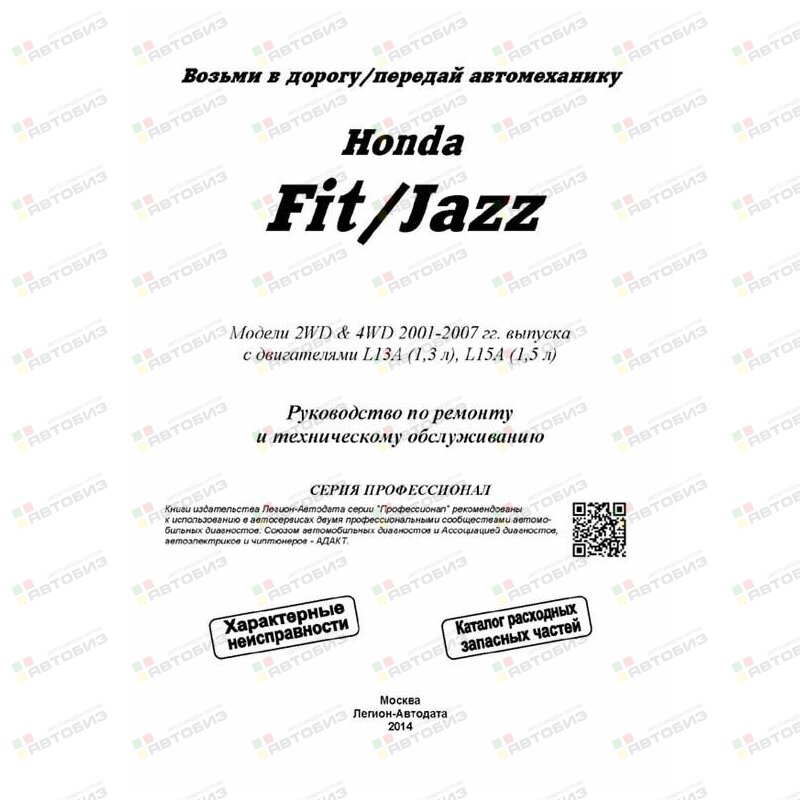 Серия «Профессионал». Каталог расходных запасных частей. Характерные неисправности. Руководство по ремонту и техническому обслуживанию. Руководство по ремонту переднеприводных и полноприводных автомобилей Honda Fit / Jazz с правосторонним и левосторонним расположением рулевого управления, оборудованных бензиновыми двигателями L13A (1,3 л) и L15A (1,5 л). Издание содержит руководство по эксплуатации, описания устройства некоторых систем (двигателя и его систем (в т. ч. VTEC и VTC), системы DPS (системы полного привода) и др.), подробные сведения по техническому обслуживанию автомобиля, ремонту и регулировке элементов систем двигателя (в т. ч. систем управления двигателем, VTEC и VTC, систем снижения токсичности (таких как, системы улавливания паров топлива, принудительной вентиляции картера, рециркуляции отработавших газов), систем зажигания, запуска и зарядки), механических и автоматических коробок передач (МКПП и АКПП), вариатора (CVT), системы полного привода (DPS), элементов тормозной системы (включая, антиблокировочную систему тормозов (ABS)), рулевого управления (включая электроусилитель рулевого управления (EPS)), подвески, кузовных элементов, систем кондиционирования и вентиляции (AC), системы пассивной безопасности (SRS). Приведены инструкции по диагностике 7 электронных систем: управления двигателем, АКПП, CVT, EPS, ABS, AC, SRS. Подробно описан 231 код неисправностей: P0, P1, U0, Flash; возможные причины возникновения. Приведены разъемы и процедуры проверки сигналов на выводах блоков управления различными системами — PinData. Представлены 41 подробная электросхема (16 систем) для различных вариантов комплектации автомобилей, описание большинства элементов электрооборудования и проверок элементов электрооборудования. Приведены возможные неисправности и методы их устранения, сопрягаемые размеры основных деталей и пределы их допустимого износа, рекомендуемые смазочные материалы, рабочие жидкости, размеры рекомендуемых и допускаемых шин и дисков. Книга будет полезна как автовладельцам, начинающим и опытным, так и профессионалам авторемонта и диагностики. Автовладелец найдет для себя полезными: инструкцию по эксплуатации, техническое обслуживание (с периодичностью и необходимыми материалами), неисправности, наиболее характерные для данного автомобиля, каталог наиболее часто востребованных запасных частей, инструкции по самостоятельному ремонту. Профессионалам будут полезны: операции по сложному ремонту, допустимые размеры деталей, адаптации и сброс настроек, необходимые после ремонта, данные по диагностике и подробные схемы электрооборудования. Книги серии «Профессионал» могут выручить Вас в дороге, если Вам придется пользоваться услугами автосервиса, незнакомого или малознакомого с особенностями модели Вашего автомобиля. Отдавая автомобиль на СТО, оставьте нашу книгу в автомобиле, и в случае каких-либо затруднений автомеханик сможет воспользоваться ею, что значительно ускорит ремонт Вашего автомобиля. Качественное изложение материала позволяет сократить время обслуживания автомобиля и сделать его более эффективным. Книга предназначена для автовладельцев, персонала СТО и ремонтных мастерских.