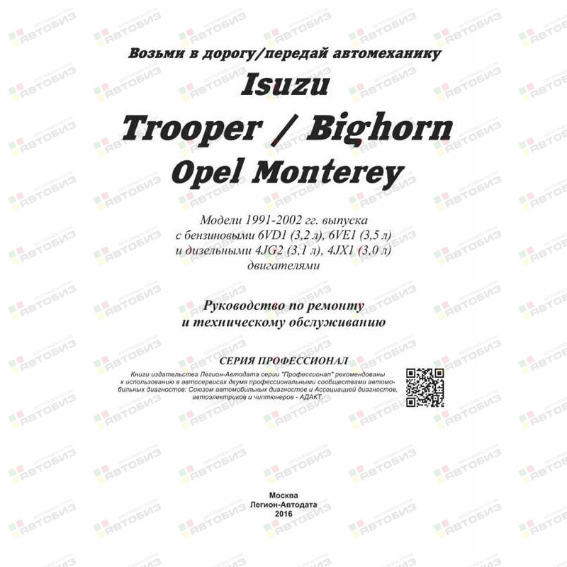 Isuzu Trooper / Bighorn & Opel Monterey. Модели 1991—2002 гг. выпуска с бензиновыми 6VD1 (3,2 л), 6VE1 (3,5 л) и дизельными 4JG2 (3,1 л), 4JX1 (3,0 л) двигателями. Серия «Профессионал». Руководство по ремонту и техническому обслуживанию