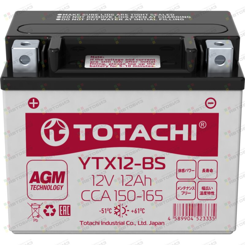 Купить яяАКБ для мото TOTACHI AGM YTX12-BS, R, 12 Ач, CCA 165A, 150*87*148, 90012 и другие автотовары в оптовом интернет-магазине Автобиз с доставкой. Мы работаем по всему Дальнему востоку и Сибири. На нашем сайте вы можете подобрать запчасти под нужный автомобиль и сразу заказать их. Всегда в наличии большой ассортимент автозапчастей, автоаксессуаров, автохимии и масел.