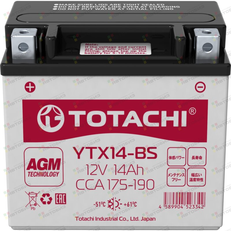 Купить яяАКБ для мото TOTACHI AGM YTX14-BS, R, 14 Ач, CCA 190A, 150*87*148, 90214 и другие автотовары в оптовом интернет-магазине Автобиз с доставкой. Мы работаем по всему Дальнему востоку и Сибири. На нашем сайте вы можете подобрать запчасти под нужный автомобиль и сразу заказать их. Всегда в наличии большой ассортимент автозапчастей, автоаксессуаров, автохимии и масел.