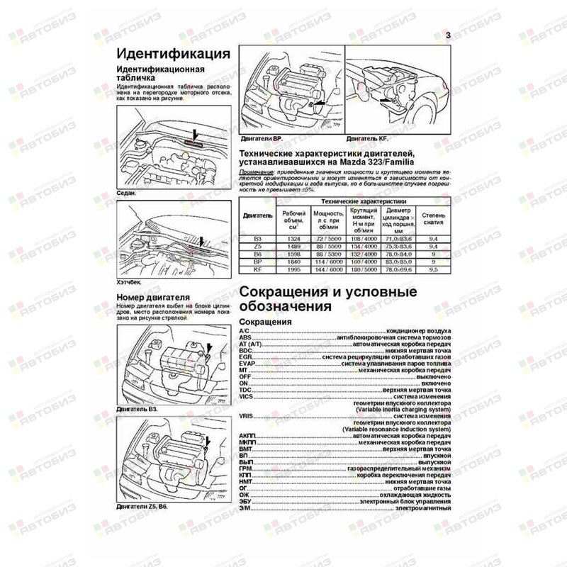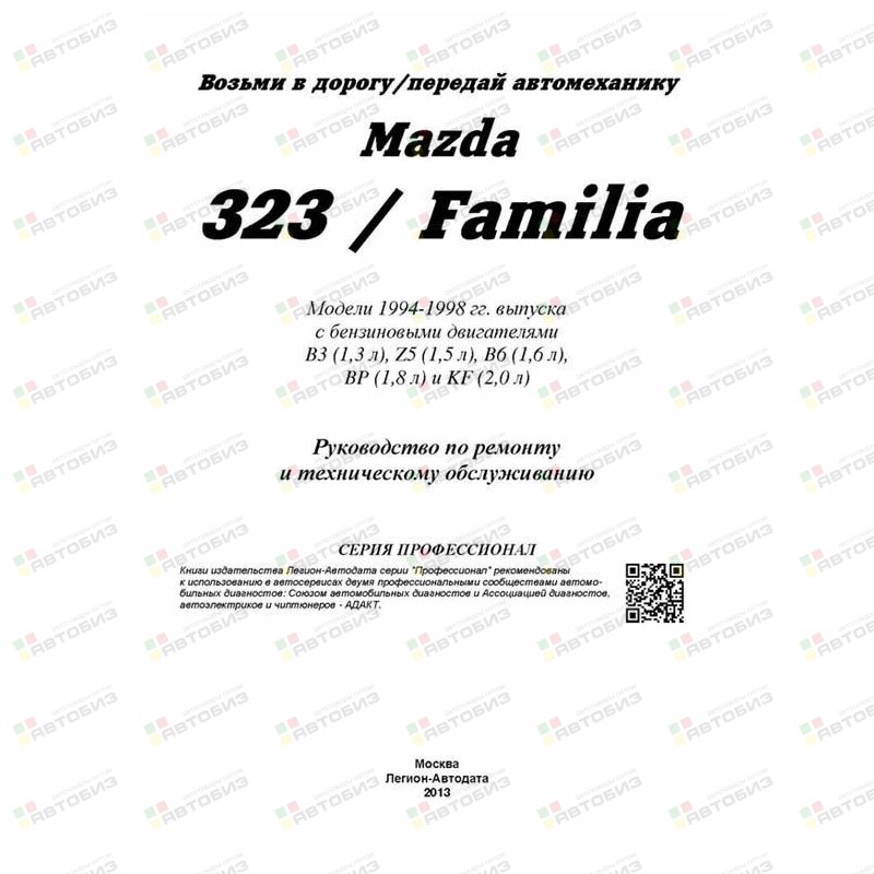 Mazda 323 / Familia. Модели 1994—1998 гг. выпуска с бензиновыми двигателями B3 (1,3 л), Z5 (1,5 л), B6 (1,6 л), BP (1,8 л) и KF (2,0 л). Руководство по ремонту и техническому обслуживанию. Серия «Профессионал»