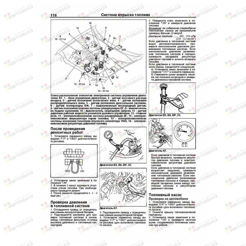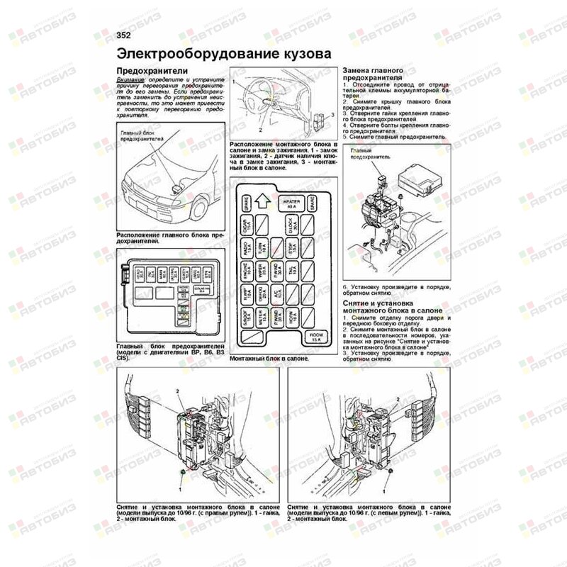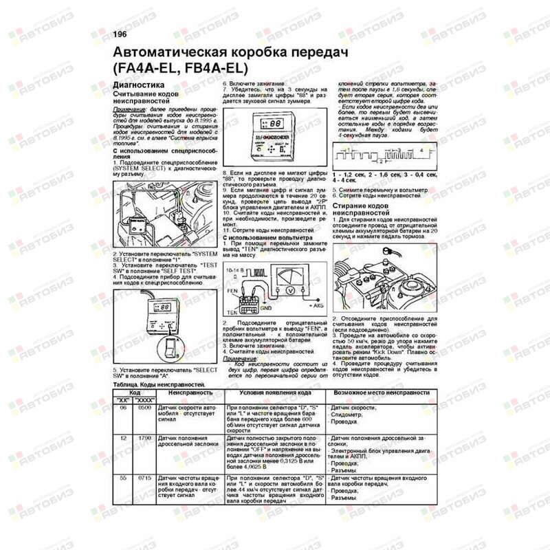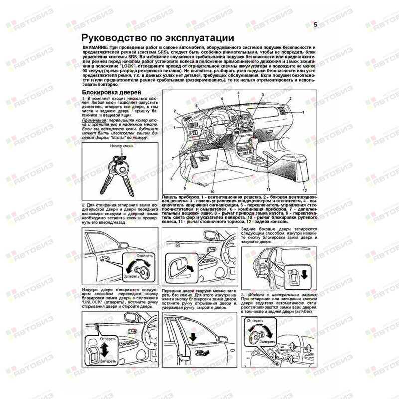 Каталог з/ч для ТО. В руководстве дается пошаговое описание процедур по эксплуатации, техническому обслуживанию и ремонту автомобилей Mazda 323 / Familia 1994—1998 гг. выпуска, оборудованных бензиновыми двигателями B3 (1,3 л), Z5 (1,5 л), B6 (1,6 л), BP (1,8 л) и KF (2,0 л). Издание содержит руководство по эксплуатации, подробные сведения по техническому обслуживанию автомобиля, диагностике, ремонту и регулировке элементов систем двигателя (в т. ч. системы управления двигателем, запуска, зарядки), рекомендации по регулировке и ремонту механических и автоматических коробок передач (МКПП и АКПП), тормозной системы (включая антиблокировочную систему тормозов (ABS)), рулевого управления (в т. ч. гидроусилителя), подвески, кузовных элементов, систем кондиционирования и вентиляции (AC), системы пассивной безопасности (SRS). Приведены инструкции по диагностике 5 электронных систем: управления двигателем, АКПП, ABS, SRS и комбинации приборов. Подробно описаны 86 кодов неисправностей; возможные причины возникновения. Приведены разъемы и процедуры проверки сигналов на выводах блоков управления различными системами — PinData. Представлены 92 подробные электросхемы для различных вариантов комплектации автомобилей, описание большинства элементов электрооборудования. Приведены возможные неисправности и методы их устранения, сопрягаемые размеры основных деталей и пределы их допустимого износа, рекомендуемые смазочные материалы, рабочие жидкости и каталожные номера запчастей необходимых для технического обслуживания, размеры рекомендуемых и допускаемых шин и дисков. Книга будет полезна как автовладельцам, начинающим и опытным, так и профессионалам авторемонта и диагностики. Автовладелец найдет для себя полезными: инструкцию по эксплуатации, техническое обслуживание (с периодичностью и необходимыми материалами), каталог запасных частей востребованных при ТО, инструкции по самостоятельному ремонту. Профессионалам будут полезны: операции по сложному ремонту, допустимые размеры деталей, данные по диагностике и подробные схемы электрооборудования. Книги серии «Профессионал» могут выручить Вас в дороге, если Вам придется пользоваться услугами автосервиса, незнакомого или малознакомого с особенностями модели Вашего автомобиля. Отдавая автомобиль на СТО, оставьте нашу книгу в автомобиле, и в случае каких-либо затруднений автомеханик сможет воспользоваться ею, что значительно ускорит ремонт Вашего автомобиля. Качественное изложение материала позволяет сократить время обслуживания автомобиля и сделать его более эффективным. Книга предназначена для автовладельцев, персонала СТО и ремонтных мастерских.
