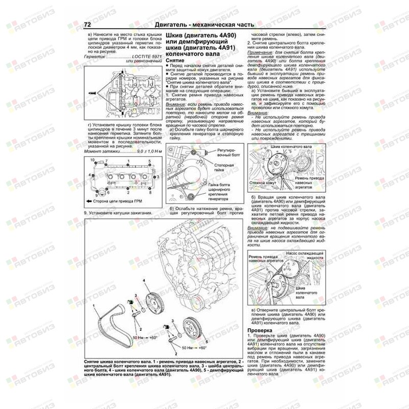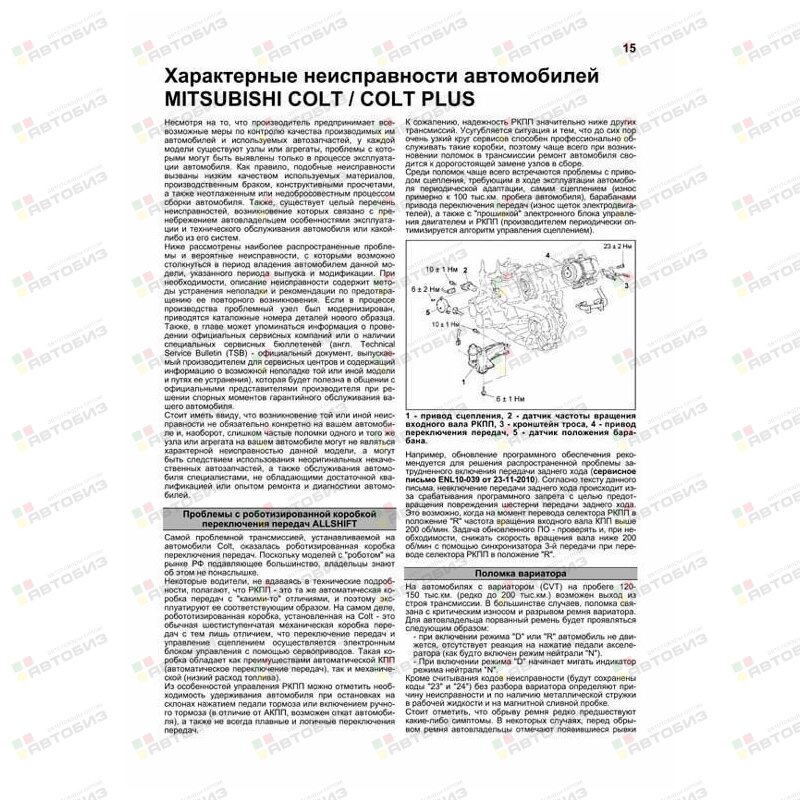 Каталог расходных запасных частей. Характерные неисправности. Полезные ссылки. Руководство по ремонту и техническому обслуживанию. Руководство по ремонту Mitsubishi Colt 2004—2012 гг. выпуска, оборудованных бензиновыми двигателями 4A90 (1,3 л) и 4A91 (1,5 л). Издание содержит руководство по эксплуатации, подробные сведения по техническому обслуживанию автомобилей, диагностике, ремонту и регулировке элементов систем двигателя (в т. ч. впрыска топлива (MPI), изменения фаз газораспределения (MIVEC), зажигания, запуска и зарядки), механической и роботизированной коробок переключения передач (МКПП и РКПП), тормозной системы (включая антиблокировочную систему тормозов (ABS), электронную систему распределения тормозных усилий (EBD), противобуксовочную систему (TLC), систему курсовой устойчивости (ASC)), рулевого управления (в т. ч. электроусилителя рулевого управления (EPS)) и под-вески, кузовных элементов, систем кондиционирования (АС), отопления и вентиляции, а также системы пассивной безопасности (SRS). Приведены инструкции по диагностике 12 электронных систем: управления двигателями, РКПП, EPS, ABS / ASC, АС, SRS, иммобилайзера, центрального замка, комбинации приборов, многофункционального дисплея, систем Mul-tiplex и CAN. Подробно описаны 463 кода неисправностей P0, P1, P2, С1, В1, U1, Flash; условия их возникновения и возможные причины. Приведены разъемы и процедуры проверки сигналов на выводах блоков управления различными системами — PinData. Представлены 84 подробные электросхемы (28 систем) для различных вариантов комплектации, описание большинства элементов электрооборудования. В разделе «Полезные ссылки» подобраны и отсортированы ссылки (в виде QR-кодов и url-ссылок) на интернет-ресурсы, содержащие наиболее интересную и грамотную информацию по Вашему автомобилю. New! Издание переработано и дополнено в 2015 году. Приведены возможные неисправности и методы их устранения, сопрягаемые размеры основных деталей и пределы их допустимого износа, рекомендуемые смазочные материалы, рабочие жидкости и номера расходных запчастей, необходимых для технического обслуживания, размеры рекомендуемых шин и дисков. Книга будет полезна как автовладельцам, начинающим и продвинутым, так и профессионалам авторемонта и диагностики. Автовладелец найдет для себя полезными: инструкцию по эксплуатации, техническое обслуживание (с периодичностью и необходимыми материалами), наиболее характерные для данного автомобиля неисправности, каталог наиболее часто востребованных запасных частей, инструкции по самостоятельному ремонту. Профессионалам будут полезны: операции по сложному ремонту, допустимые размеры деталей, данные по диагностике и подробные схемы электрооборудования. Книги серии «Профессионал» могут выручить вас в дороге, если вам придется пользоваться услугами автосервиса, незнакомого или малознакомого с особенностями модели вашего автомобиля. Отдавая автомобиль на СТО, оставьте нашу книгу в автомобиле, и в случае каких-либо затруднений автомеханик сможет воспользоваться ею, что значительно ускорит ремонт Вашего автомобиля. Качественное изложение материала позволяет сократить время обслуживания автомобиля и сделать его более эффективным. Книга предназначена для автовладельцев, персонала СТО и ремонтных мастерских.