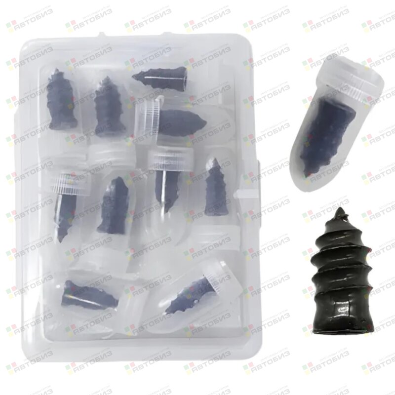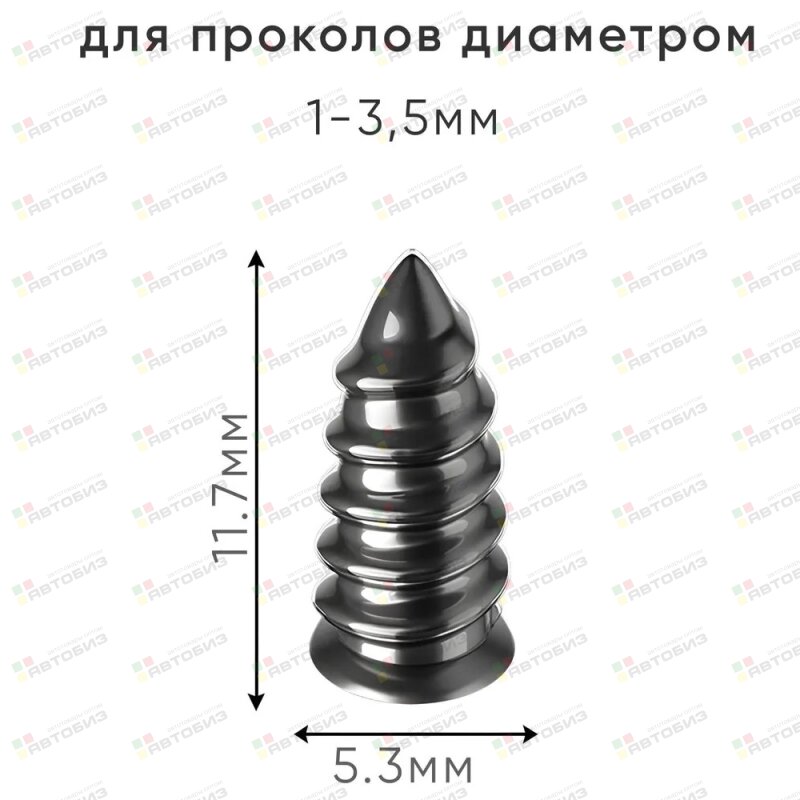 Каждый саморез упакован в индивидуальный контейнер для предотвращения высыхания резины, а весь набор из 10 штук убран в удобный контейнер. Размер M (5,3 мм) позволяет эффективно закрывать проколы от 1 до 3,5 мм.