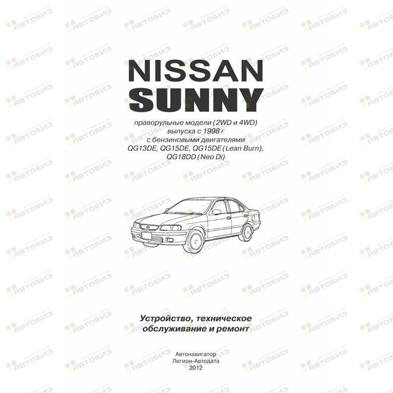 В издании представлено руководство по эксплуатации, техническому обслуживанию и ремонту праворульных автомобилей NISSAN SUNNY (модели 2WD и 4WD) выпуска c 1998 г., оснащенных бензиновыми двигателями QG13DE, QG15DE, QG15DE (Lean Burn), QG18DD (Neo Di) с различными системами подготовки смеси (DE — с распределённым впрыском, DE (Lean Burn) — двигатели, работающие на сверхобедненной смеси, DD — двигатель с непосредственным впрыском топлива). Рассмотрены системы непосредственного зажигания, завихрения воздуха, топливная система высокого давления (на двигателе DD). Издание содержит подробные инструкции по обслуживанию, диагностике, ремонту и регулировке двигателей и систем управления двигателями, тормозной системы (включая антиблокировочную систему ABS), АКП, CVT, рулевого управления и т. д. Подробно представлены процедуры самодиагностики и коды неисправностей систем управления двигателем, АКП, CVT, и ABS и т. д. Представлен полный комплект электрических схем. Имеющаяся в руководстве информация позволит автовладельцам самостоятельно проводить грамотное обслуживание автомобиля и не доводить его состояние до дорогостоящего ремонта. В случае ремонта, данное руководство послужит незаменимым средством по выявлению и устранению неисправностей во всех компонентах автомобиля. Пошаговое и наглядное описание ремонтных процедур, изобилие рисунков, обширные справочные ремонтные данные позволят квалифицированно подобрать варианты замены запчастей, произвести соответствующие регулировки, правку кузова и т. д. Книга предназначена для персонала СТО, ремонтных мастерских и автовладельцев.