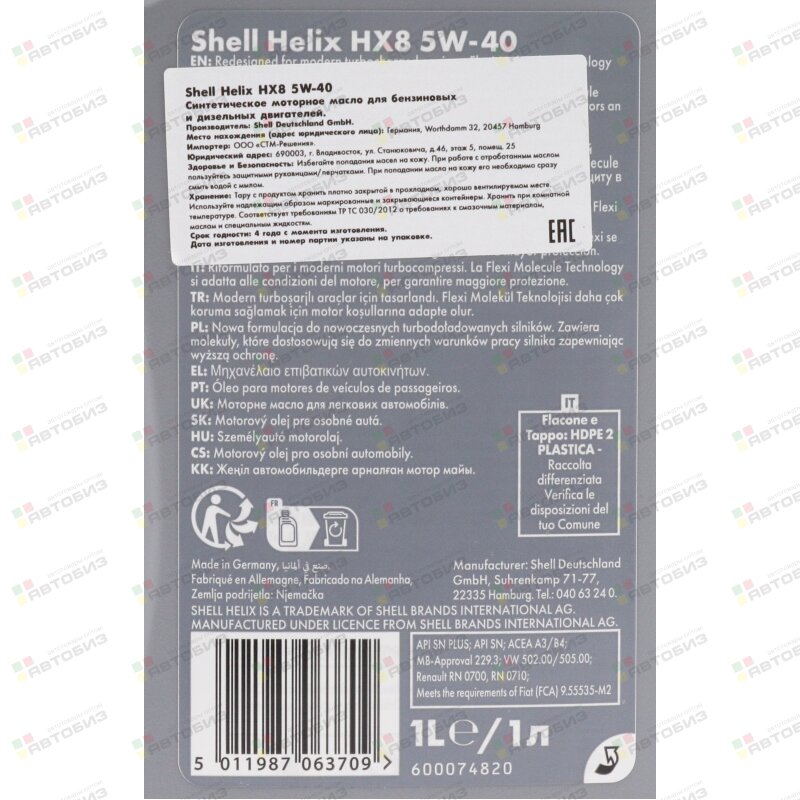 Моторное масло Shell Helix HX8 Synthetic защищает двигатель современного автомобиля и сохраняет его чистым. Данное масло помогает предотвратить образование отложений на деталях двигателя, наличие которых может привести к ухудшению эксплуатационных характеристик. Превосходная защита от образования отложений подходит для всех интервалов замены масла, рекомендованных автопроизводителями.
