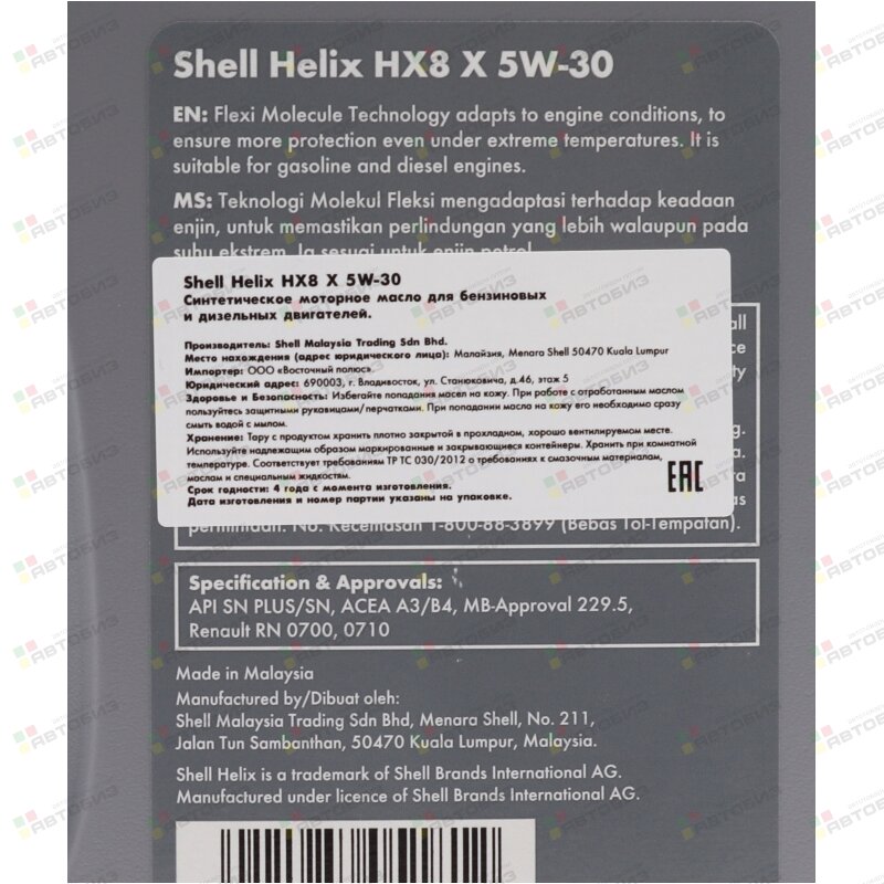 Купить SHELL Helix HX8 X 5W30 SP/SN A3/В3/B4 синтетика 1л (1/12), 550050810 и другие автотовары в оптовом интернет-магазине Автобиз с доставкой. Мы работаем по всему Дальнему востоку и Сибири. На нашем сайте вы можете подобрать запчасти под нужный автомобиль и сразу заказать их. Всегда в наличии большой ассортимент автозапчастей, автоаксессуаров, автохимии и масел.