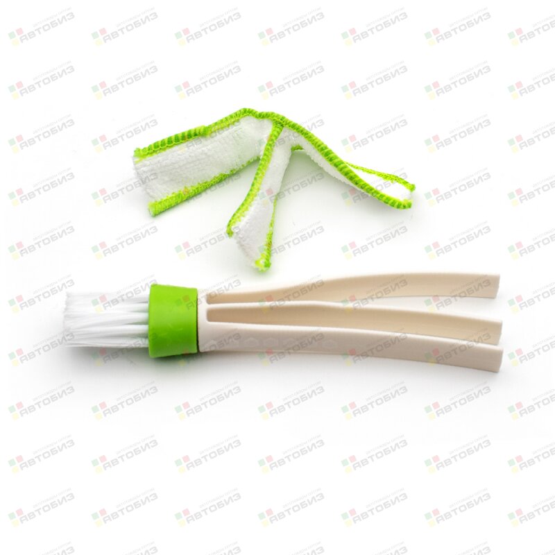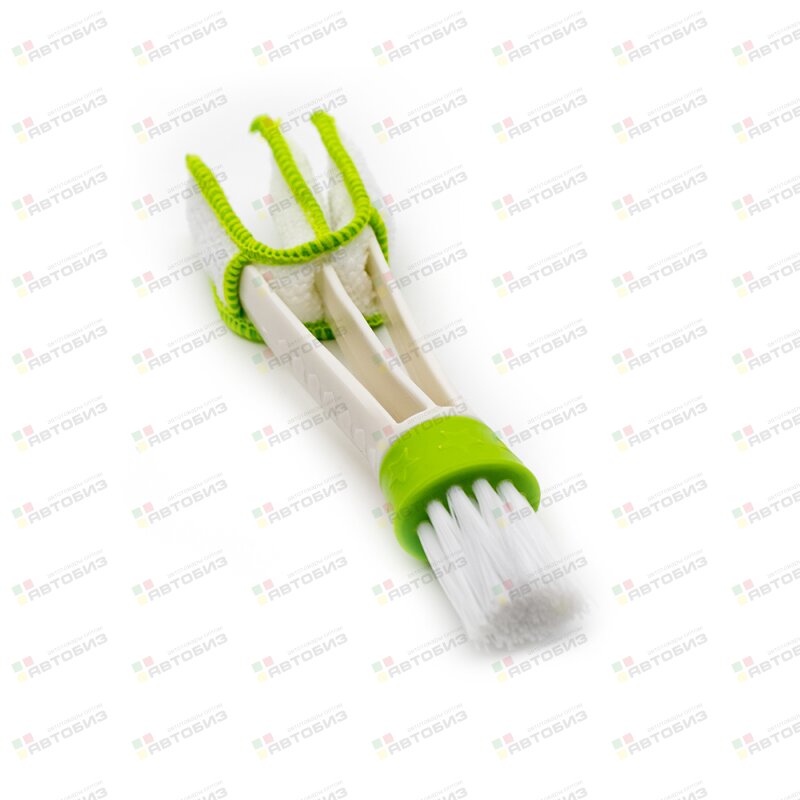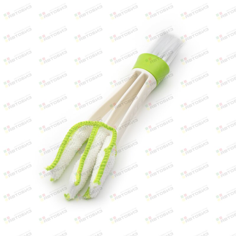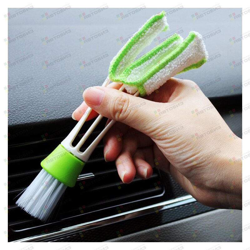 Удобная двусторонняя щётка-кисть для чистки труднодоступных мест в автомобиле. С одной стороны кисточки расположена жесткая гибкая щетина, с другой специальные плоскости для очистки дефлектора со съемными насадками из мягкой микрофибры. Такую щетку так же можно использовать для очистки от пыли жалюзи, клавиатуры и тд.
