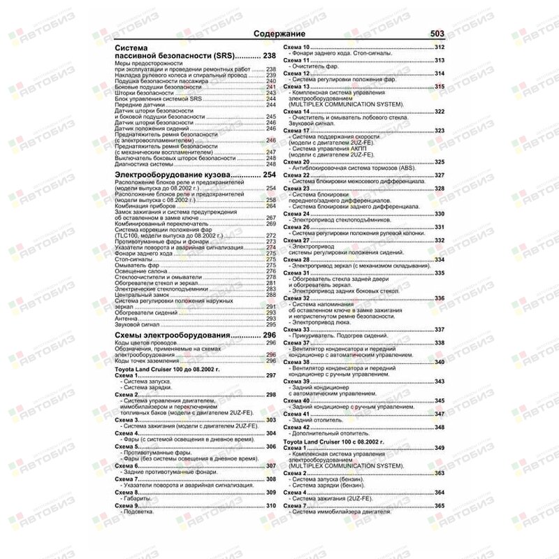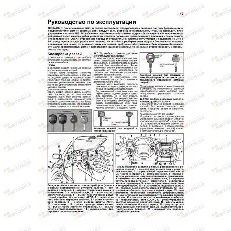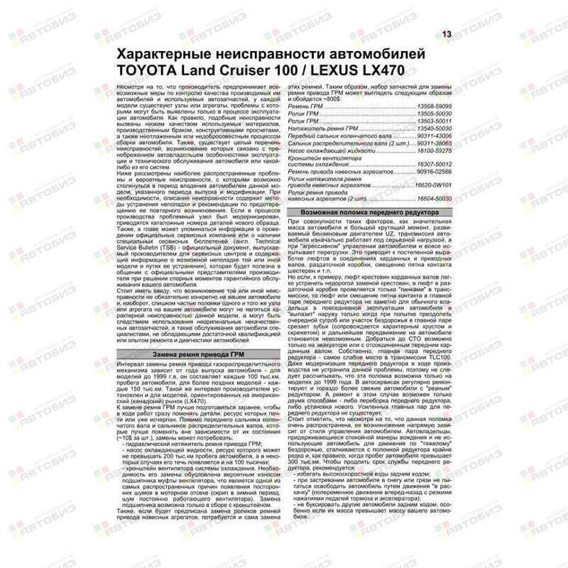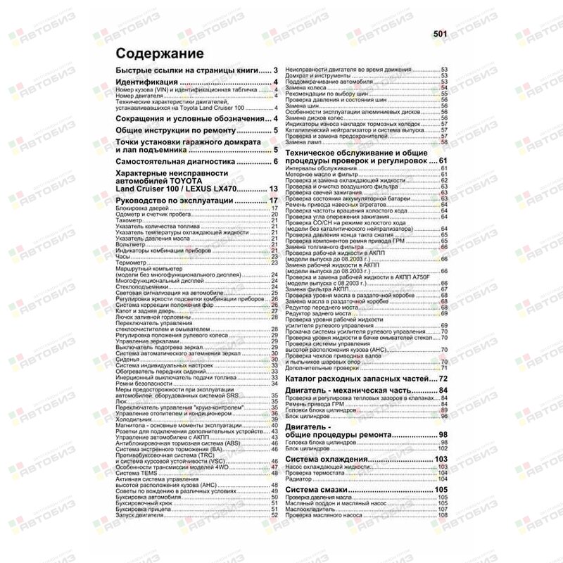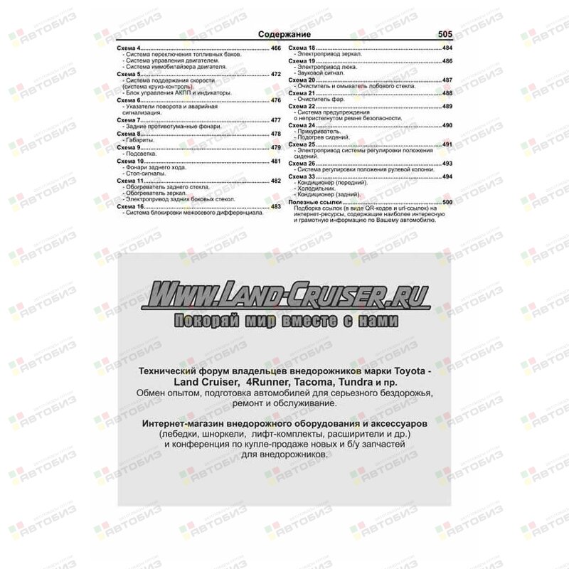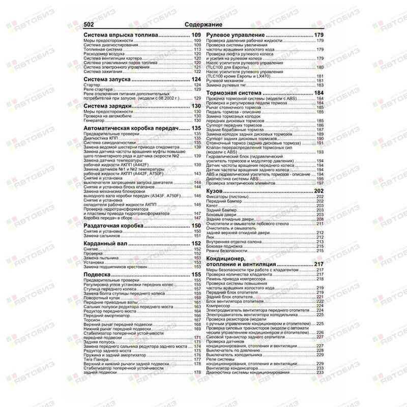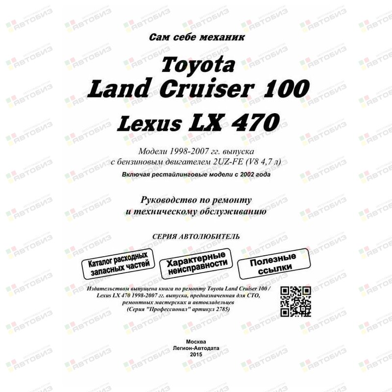 Каталог расходных запасных частей. Характерные неисправности. Полезные ссылки. Руководство по ремонту и техническому обслуживанию. Руководство по ремонту Toyota Land Cruiser 100 & Lexus LX470 1998—2007 гг. выпуска, оборудованных бензиновым двигателем 2UZ-FE (V8 4,7 л). В издание включены сведения по рестайлинговым моделям Toyota Land Cruiser 100 и Lexus LX 470 с 2002 года выпуска. Издание содержит руководство по эксплуатации, подробные сведения по техническому обслуживанию автомобилей, ремонту и регулировке некоторых элементов систем двигателя (в т. ч. системы впрыска топлива, снижения токсичности, зажигания, систем смазки и охлаждения, запуска и зарядки), элементов автоматических коробок передач (АКПП), раздаточной коробки, тормозной системы (включая антиблокировочную систему тормозов (ABS), систему курсовой устойчивости (VSC)), рулевого управления, переднего редуктора, редуктора заднего моста, подвески, кузовных элементов, систем кондиционирования и вентиляции. Приведены инструкции по диагностике 6 электронных систем: управления двигателем, АКПП, ABS, VSC, системы кондиционирования (AC), SRS. Описано 280 кодов неисправностей P0, P1, C0, С1, В0, B1, Flash; указаны возможные причины неисправностей. Представлены 203 основные электросхемы (18 систем) для различных вариантов комплектации автомобилей для рынков Европы, Японии, США и стран общего основного экспорта, включая рестайлинговые модели с 2002 года выпуска. Приведено описание основных элементов электрооборудования. New 2015! В разделе «Полезные ссылки» подобраны и отсортированы ссылки (в виде QR-кодов и url-ссылок) на интернет-ресурсы, содержащие наиболее интересную и грамотную информацию по Вашему автомобилю. Приведены возможные неисправности и методы их устранения, сопрягаемые размеры основных деталей и пределы их допустимого износа, рекомендуемые смазочные материалы, рабочие жидкости и каталожные номера запчастей, необходимых для технического обслуживания, размеры рекомендуемых и допускаемых шин и дисков. Книга серии «Автолюбитель» позволит вам самостоятельно проводить периодическое техническое обслуживание автомобиля или несложный ремонт, для которого не нужно дорогостоящего оборудования. Также книга серии «Автолюбитель» может выручить вас в дороге, если вам придется пользоваться услугами автосервиса, незнакомого или малознакомого с особенностями модели вашего автомобиля. Для более сложного ремонта в книге представлены основные электросхемы и базовая диагностика электронных систем. Каталожные номера расходных запчастей и описание схем самостоятельной покупки запчастей, а также подробное рассмотрение конструкции узлов автомобиля дадут вам возможность сэкономить на приобретении запчастей. Наиболее характерные для данного автомобиля неисправности помогут вам устранить «болезни» автомобиля и предотвратить дорогостоящий ремонт. Качественное изложение материала позволяет сократить время обслуживания автомобиля и сделать его более эффективным. Книга предназначена для автовладельцев, персонала СТО и ремонтных мастерских.