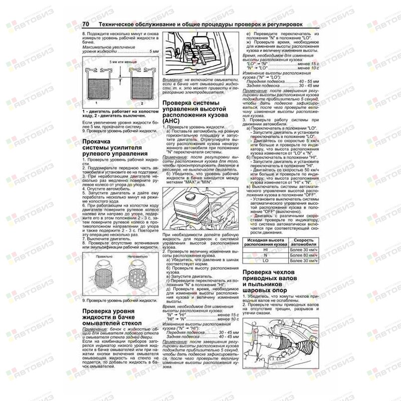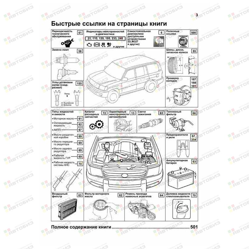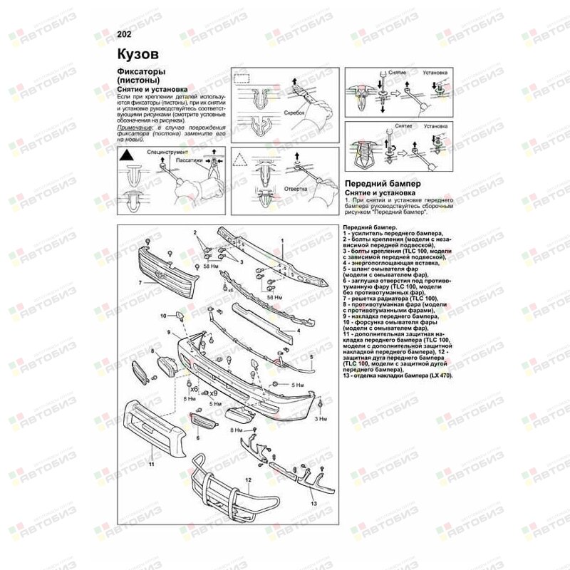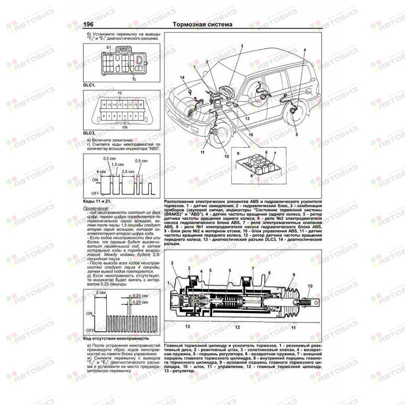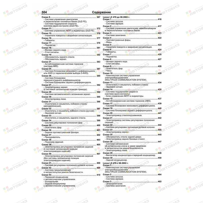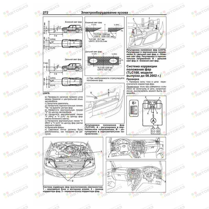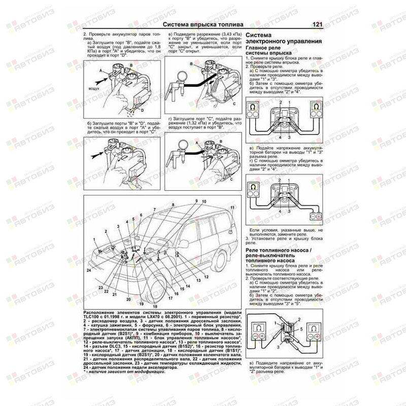 Каталог расходных запасных частей. Характерные неисправности. Полезные ссылки. Руководство по ремонту и техническому обслуживанию. Руководство по ремонту Toyota Land Cruiser 100 & Lexus LX470 1998—2007 гг. выпуска, оборудованных бензиновым двигателем 2UZ-FE (V8 4,7 л). В издание включены сведения по рестайлинговым моделям Toyota Land Cruiser 100 и Lexus LX 470 с 2002 года выпуска. Издание содержит руководство по эксплуатации, подробные сведения по техническому обслуживанию автомобилей, ремонту и регулировке некоторых элементов систем двигателя (в т. ч. системы впрыска топлива, снижения токсичности, зажигания, систем смазки и охлаждения, запуска и зарядки), элементов автоматических коробок передач (АКПП), раздаточной коробки, тормозной системы (включая антиблокировочную систему тормозов (ABS), систему курсовой устойчивости (VSC)), рулевого управления, переднего редуктора, редуктора заднего моста, подвески, кузовных элементов, систем кондиционирования и вентиляции. Приведены инструкции по диагностике 6 электронных систем: управления двигателем, АКПП, ABS, VSC, системы кондиционирования (AC), SRS. Описано 280 кодов неисправностей P0, P1, C0, С1, В0, B1, Flash; указаны возможные причины неисправностей. Представлены 203 основные электросхемы (18 систем) для различных вариантов комплектации автомобилей для рынков Европы, Японии, США и стран общего основного экспорта, включая рестайлинговые модели с 2002 года выпуска. Приведено описание основных элементов электрооборудования. New 2015! В разделе «Полезные ссылки» подобраны и отсортированы ссылки (в виде QR-кодов и url-ссылок) на интернет-ресурсы, содержащие наиболее интересную и грамотную информацию по Вашему автомобилю. Приведены возможные неисправности и методы их устранения, сопрягаемые размеры основных деталей и пределы их допустимого износа, рекомендуемые смазочные материалы, рабочие жидкости и каталожные номера запчастей, необходимых для технического обслуживания, размеры рекомендуемых и допускаемых шин и дисков. Книга серии «Автолюбитель» позволит вам самостоятельно проводить периодическое техническое обслуживание автомобиля или несложный ремонт, для которого не нужно дорогостоящего оборудования. Также книга серии «Автолюбитель» может выручить вас в дороге, если вам придется пользоваться услугами автосервиса, незнакомого или малознакомого с особенностями модели вашего автомобиля. Для более сложного ремонта в книге представлены основные электросхемы и базовая диагностика электронных систем. Каталожные номера расходных запчастей и описание схем самостоятельной покупки запчастей, а также подробное рассмотрение конструкции узлов автомобиля дадут вам возможность сэкономить на приобретении запчастей. Наиболее характерные для данного автомобиля неисправности помогут вам устранить «болезни» автомобиля и предотвратить дорогостоящий ремонт. Качественное изложение материала позволяет сократить время обслуживания автомобиля и сделать его более эффективным. Книга предназначена для автовладельцев, персонала СТО и ремонтных мастерских.